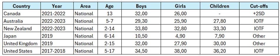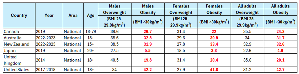 The statistics in the table above can be found on (ObesityWorld), which indicates the prevalence of adult obesity in Canada, Australia, New Zealand, Japan, the United Kingdom and the United States, with a BMI of 25-29.9 and greater than 30 for both men and women.