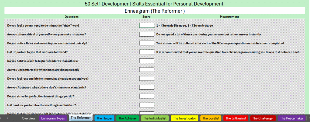 The spreadsheet will assess your answers, score the results, identify which of the nine personalities you are and provide a list of actions you can take to improve your self-development.